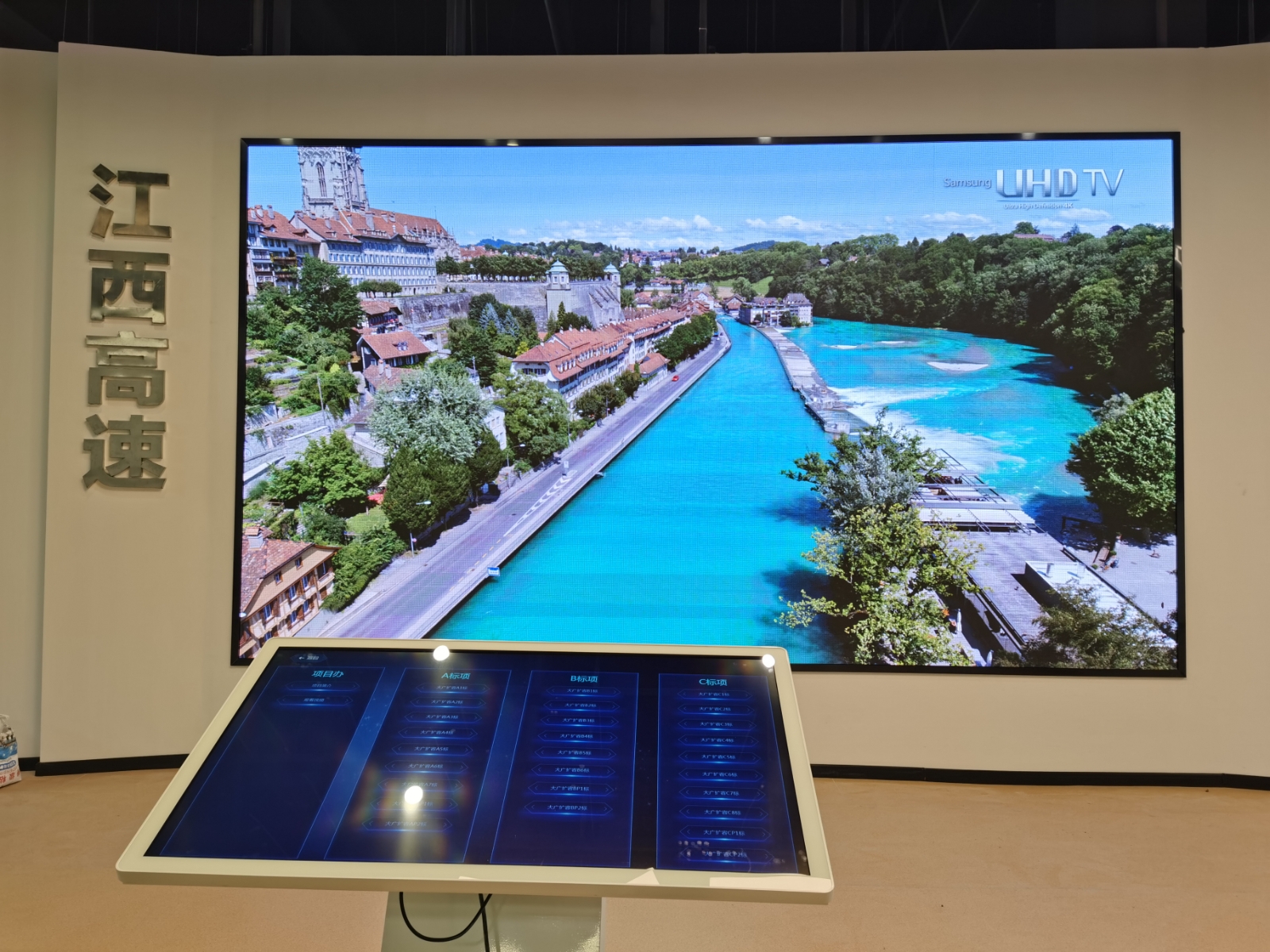 投影系统采用3台单片DLP工程投影机MAX129。相邻通道投影机之间采用纯硬件边融合和非线性几何校正技术,组成一套无缝拼接的宽屏投影显示系统,图像显示在一个宽10米左右、高1.6米的无缝正投屏幕上。