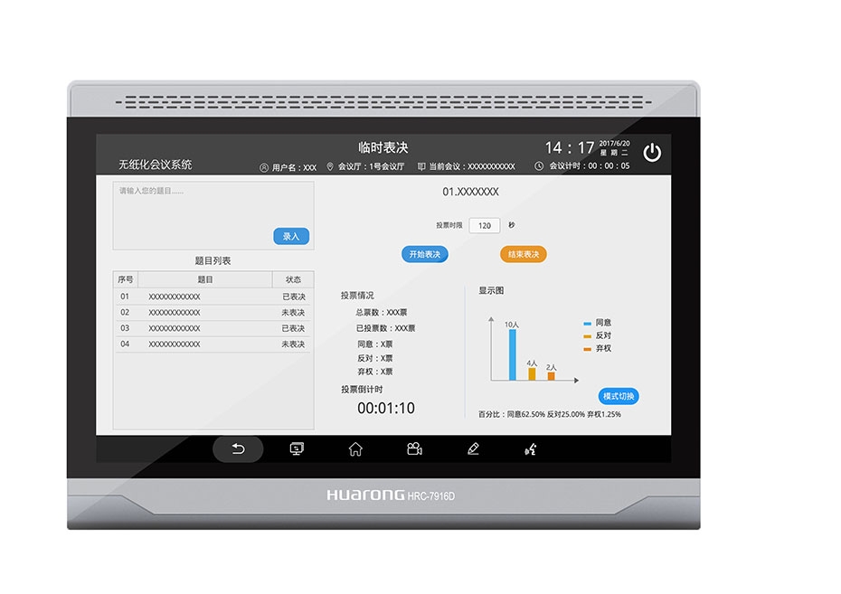 产品简介:电子桌牌HRC-7916支持会议资料查看功能,上传会议中所需用到的会议资料 点击“上传资料”按钮打开上传窗口,可多文件同时导入再统一把文件推送至终端,终端上直接触控察看文件。